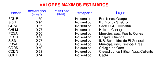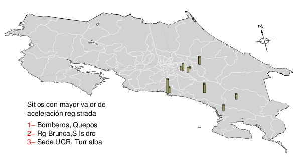 Intensidades en sitios de registro.Cada uno de los cuadrados en el mapa corresponde a la ubicación de un acelerógrafo al momento del sismo. Estos se muestran en distintos colores según la escala mostrada al pie de la figura.
