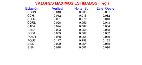 La siguiente tabla muestra los datos de aceleración máxima para cada componente en porcentaje de la aceleración de la gravedad (%g). Estos se obtienen dividiendo el valor del PGA registrado por 980 cm/s2 y multiplicándolo por 100.