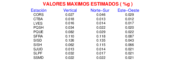 La siguiente tabla muestra los datos de aceleración máxima para cada componente en porcentaje de la aceleración de la gravedad (%g). Estos se obtienen dividiendo el valor del PGA registrado por 980 cm/s2 y multiplicándolo por 100.