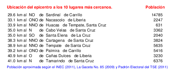 Mapa de la zona epicentral. Se muestran las poblaciones más cercanas al epicentro y fallas activas. Abajo están las distancias que hay del epicentro a cada uno de los diez sitios más cercanos y la cantidad de habitantes que poseen.