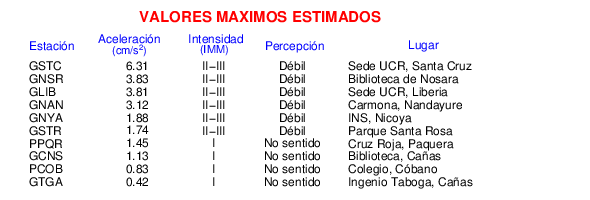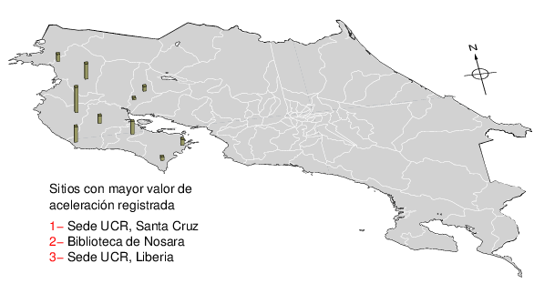 Intensidades en sitios de registro.Cada uno de los cuadrados en el mapa corresponde a la ubicación de un acelerógrafo al momento del sismo. Estos se muestran en distintos colores según la escala mostrada al pie de la figura.