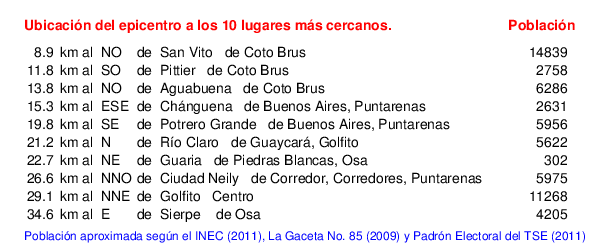 Mapa de la zona epicentral. Se muestran las poblaciones más cercanas al epicentro y fallas activas. Abajo están las distancias que hay del epicentro a cada uno de los diez sitios más cercanos y la cantidad de habitantes que poseen.