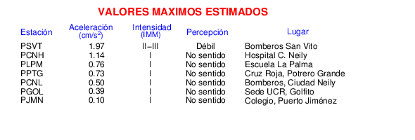 Intensidades en sitios de registro.Cada uno de los cuadrados en el mapa corresponde a la ubicación de un acelerógrafo al momento del sismo. Estos se muestran en distintos colores según la escala mostrada al pie de la figura.