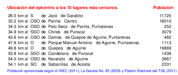 Mapa de la zona epicentral. Se muestran las poblaciones más cercanas al epicentro y fallas activas. Abajo están las distancias que hay del epicentro a cada uno de los diez sitios más cercanos y la cantidad de habitantes que poseen.