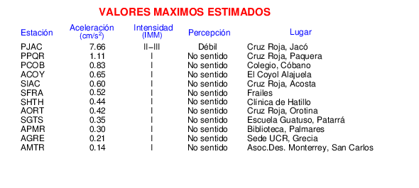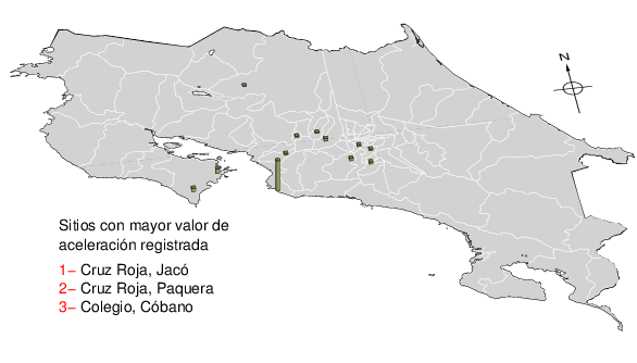 Intensidades en sitios de registro.Cada uno de los cuadrados en el mapa corresponde a la ubicación de un acelerógrafo al momento del sismo. Estos se muestran en distintos colores según la escala mostrada al pie de la figura.