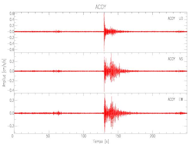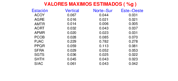 La siguiente tabla muestra los datos de aceleración máxima para cada componente en porcentaje de la aceleración de la gravedad (%g). Estos se obtienen dividiendo el valor del PGA registrado por 980 cm/s2 y multiplicándolo por 100.