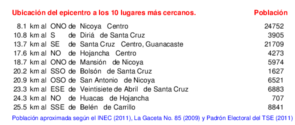 Mapa de la zona epicentral. Se muestran las poblaciones más cercanas al epicentro y fallas activas. Abajo están las distancias que hay del epicentro a cada uno de los diez sitios más cercanos y la cantidad de habitantes que poseen.