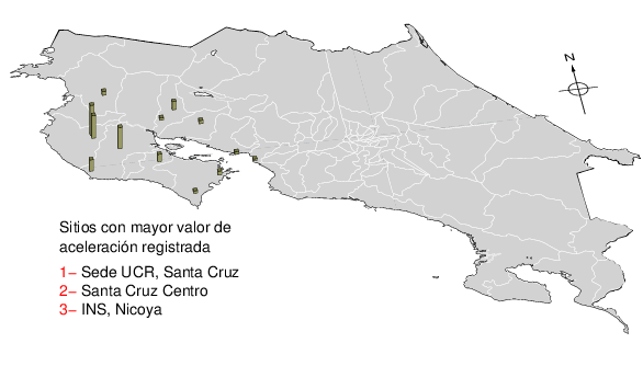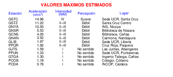 Intensidades en sitios de registro.Cada uno de los cuadrados en el mapa corresponde a la ubicación de un acelerógrafo al momento del sismo. Estos se muestran en distintos colores según la escala mostrada al pie de la figura.