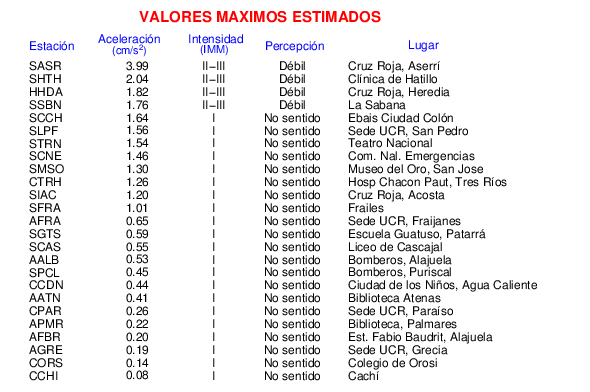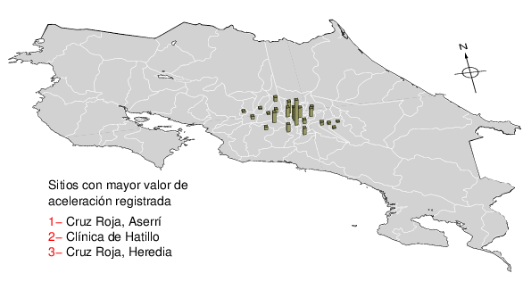 Intensidades en sitios de registro.Cada uno de los cuadrados en el mapa corresponde a la ubicación de un acelerógrafo al momento del sismo. Estos se muestran en distintos colores según la escala mostrada al pie de la figura.
