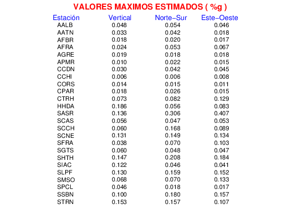 La siguiente tabla muestra los datos de aceleración máxima para cada componente en porcentaje de la aceleración de la gravedad (%g). Estos se obtienen dividiendo el valor del PGA registrado por 980 cm/s2 y multiplicándolo por 100.
