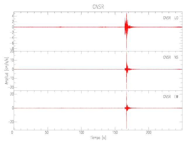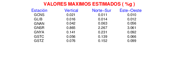 La siguiente tabla muestra los datos de aceleración máxima para cada componente en porcentaje de la aceleración de la gravedad (%g). Estos se obtienen dividiendo el valor del PGA registrado por 980 cm/s2 y multiplicándolo por 100.
