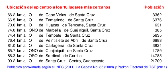 Mapa de la zona epicentral. Se muestran las poblaciones más cercanas al epicentro y fallas activas. Abajo están las distancias que hay del epicentro a cada uno de los diez sitios más cercanos y la cantidad de habitantes que poseen.