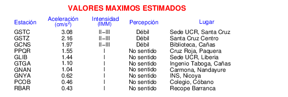 Intensidades en sitios de registro.Cada uno de los cuadrados en el mapa corresponde a la ubicación de un acelerógrafo al momento del sismo. Estos se muestran en distintos colores según la escala mostrada al pie de la figura.