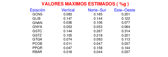 La siguiente tabla muestra los datos de aceleración máxima para cada componente en porcentaje de la aceleración de la gravedad (%g). Estos se obtienen dividiendo el valor del PGA registrado por 980 cm/s2 y multiplicándolo por 100.