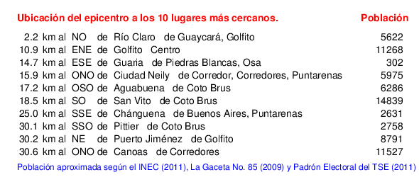 Mapa de la zona epicentral. Se muestran las poblaciones más cercanas al epicentro y fallas activas. Abajo están las distancias que hay del epicentro a cada uno de los diez sitios más cercanos y la cantidad de habitantes que poseen.