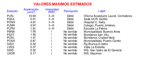 Intensidades en sitios de registro.Cada uno de los cuadrados en el mapa corresponde a la ubicación de un acelerógrafo al momento del sismo. Estos se muestran en distintos colores según la escala mostrada al pie de la figura.