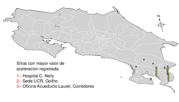 Intensidades en sitios de registro.Cada uno de los cuadrados en el mapa corresponde a la ubicación de un acelerógrafo al momento del sismo. Estos se muestran en distintos colores según la escala mostrada al pie de la figura.