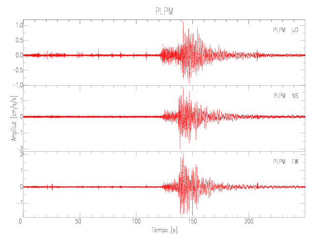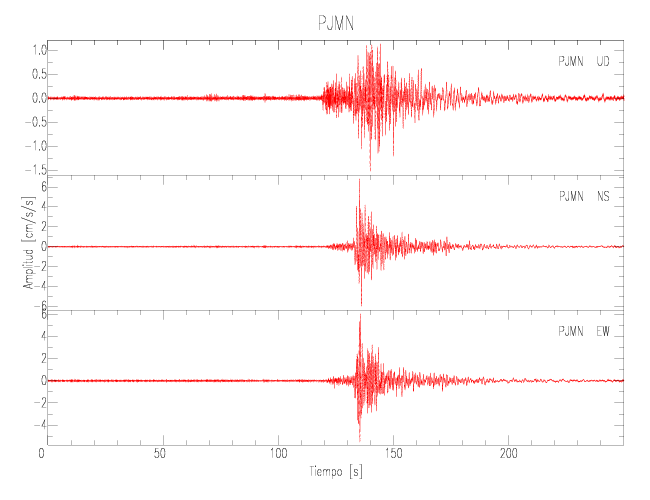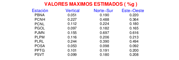 La siguiente tabla muestra los datos de aceleración máxima para cada componente en porcentaje de la aceleración de la gravedad (%g). Estos se obtienen dividiendo el valor del PGA registrado por 980 cm/s2 y multiplicándolo por 100.
