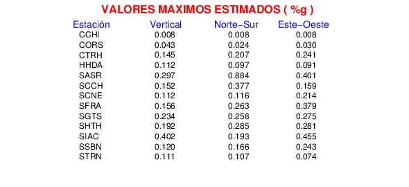 La siguiente tabla muestra los datos de aceleración máxima para cada componente en porcentaje de la aceleración de la gravedad (%g). Estos se obtienen dividiendo el valor del PGA registrado por 980 cm/s2 y multiplicándolo por 100.