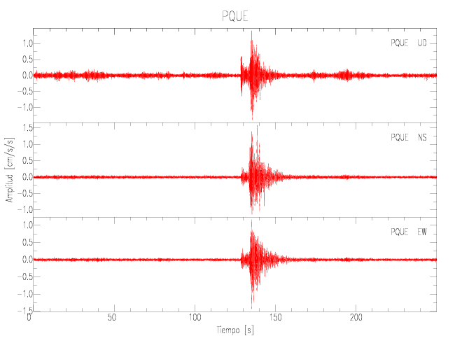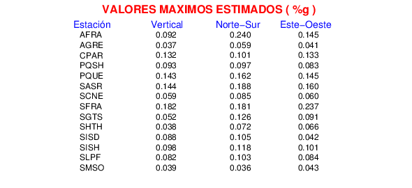 La siguiente tabla muestra los datos de aceleración máxima para cada componente en porcentaje de la aceleración de la gravedad (%g). Estos se obtienen dividiendo el valor del PGA registrado por 980 cm/s2 y multiplicándolo por 100.