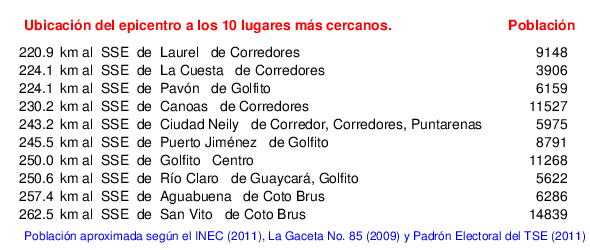 Mapa de la zona epicentral. Se muestran las poblaciones más cercanas al epicentro y fallas activas. Abajo están las distancias que hay del epicentro a cada uno de los diez sitios más cercanos y la cantidad de habitantes que poseen.