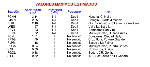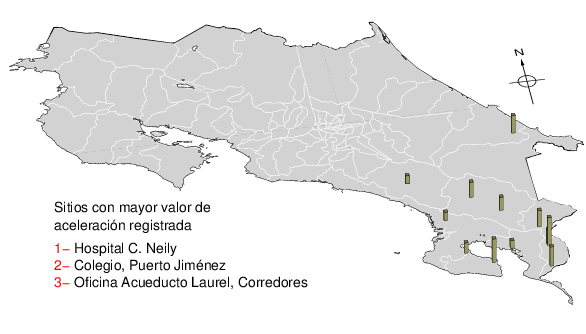 Intensidades en sitios de registro.Cada uno de los cuadrados en el mapa corresponde a la ubicación de un acelerógrafo al momento del sismo. Estos se muestran en distintos colores según la escala mostrada al pie de la figura.