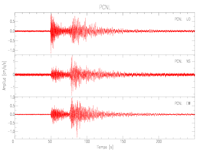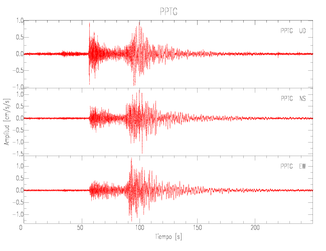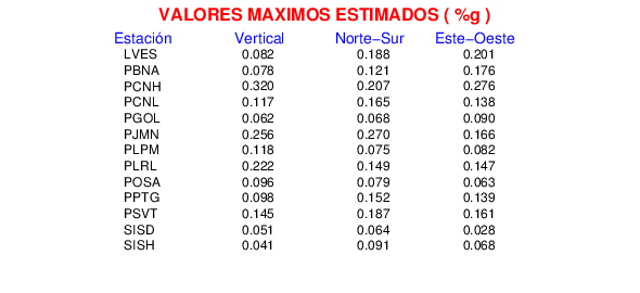 La siguiente tabla muestra los datos de aceleración máxima para cada componente en porcentaje de la aceleración de la gravedad (%g). Estos se obtienen dividiendo el valor del PGA registrado por 980 cm/s2 y multiplicándolo por 100.
