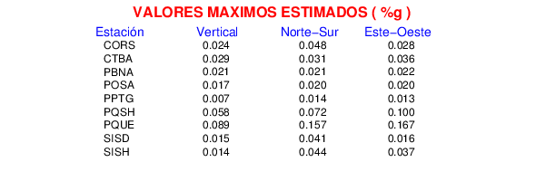 La siguiente tabla muestra los datos de aceleración máxima para cada componente en porcentaje de la aceleración de la gravedad (%g). Estos se obtienen dividiendo el valor del PGA registrado por 980 cm/s2 y multiplicándolo por 100.