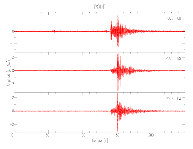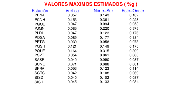 La siguiente tabla muestra los datos de aceleración máxima para cada componente en porcentaje de la aceleración de la gravedad (%g). Estos se obtienen dividiendo el valor del PGA registrado por 980 cm/s2 y multiplicándolo por 100.