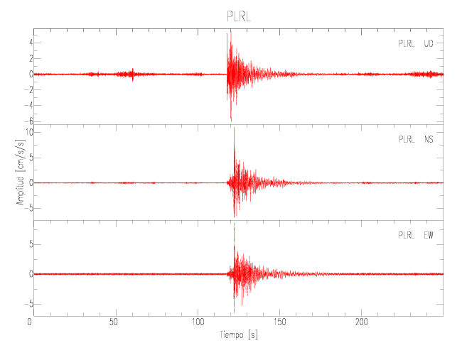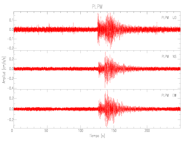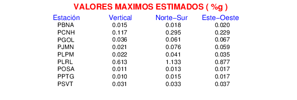 La siguiente tabla muestra los datos de aceleración máxima para cada componente en porcentaje de la aceleración de la gravedad (%g). Estos se obtienen dividiendo el valor del PGA registrado por 980 cm/s2 y multiplicándolo por 100.