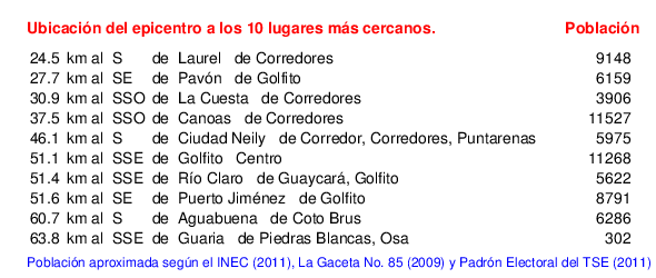 Mapa de la zona epicentral. Se muestran las poblaciones más cercanas al epicentro y fallas activas. Abajo están las distancias que hay del epicentro a cada uno de los diez sitios más cercanos y la cantidad de habitantes que poseen.