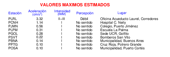 Intensidades en sitios de registro.Cada uno de los cuadrados en el mapa corresponde a la ubicación de un acelerógrafo al momento del sismo. Estos se muestran en distintos colores según la escala mostrada al pie de la figura.