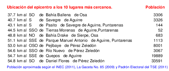 Mapa de la zona epicentral. Se muestran las poblaciones más cercanas al epicentro y fallas activas. Abajo están las distancias que hay del epicentro a cada uno de los diez sitios más cercanos y la cantidad de habitantes que poseen.