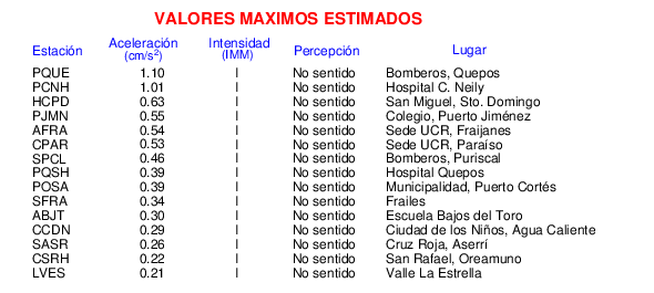 Intensidades en sitios de registro.Cada uno de los cuadrados en el mapa corresponde a la ubicación de un acelerógrafo al momento del sismo. Estos se muestran en distintos colores según la escala mostrada al pie de la figura.