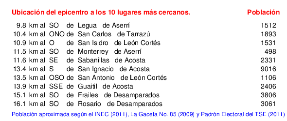 Mapa de la zona epicentral. Se muestran las poblaciones más cercanas al epicentro y fallas activas. Abajo están las distancias que hay del epicentro a cada uno de los diez sitios más cercanos y la cantidad de habitantes que poseen.