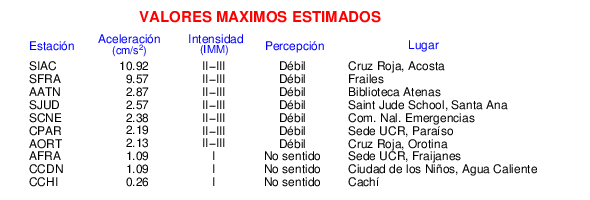 Intensidades en sitios de registro.Cada uno de los cuadrados en el mapa corresponde a la ubicación de un acelerógrafo al momento del sismo. Estos se muestran en distintos colores según la escala mostrada al pie de la figura.
