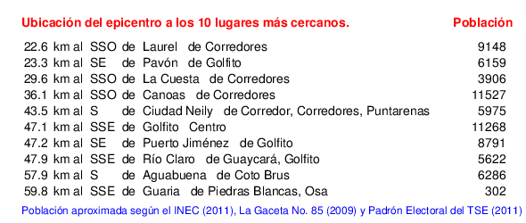 Mapa de la zona epicentral. Se muestran las poblaciones más cercanas al epicentro y fallas activas. Abajo están las distancias que hay del epicentro a cada uno de los diez sitios más cercanos y la cantidad de habitantes que poseen.