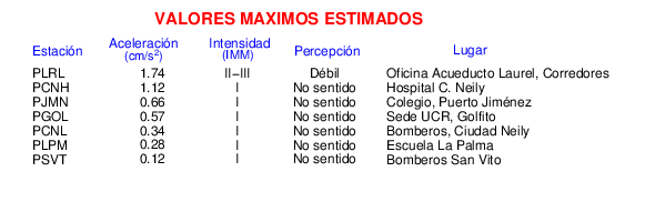 Intensidades en sitios de registro.Cada uno de los cuadrados en el mapa corresponde a la ubicación de un acelerógrafo al momento del sismo. Estos se muestran en distintos colores según la escala mostrada al pie de la figura.