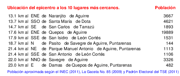 Mapa de la zona epicentral. Se muestran las poblaciones más cercanas al epicentro y fallas activas. Abajo están las distancias que hay del epicentro a cada uno de los diez sitios más cercanos y la cantidad de habitantes que poseen.