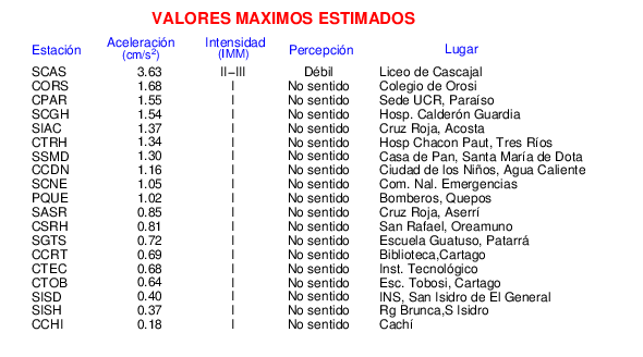Intensidades en sitios de registro.Cada uno de los cuadrados en el mapa corresponde a la ubicación de un acelerógrafo al momento del sismo. Estos se muestran en distintos colores según la escala mostrada al pie de la figura.