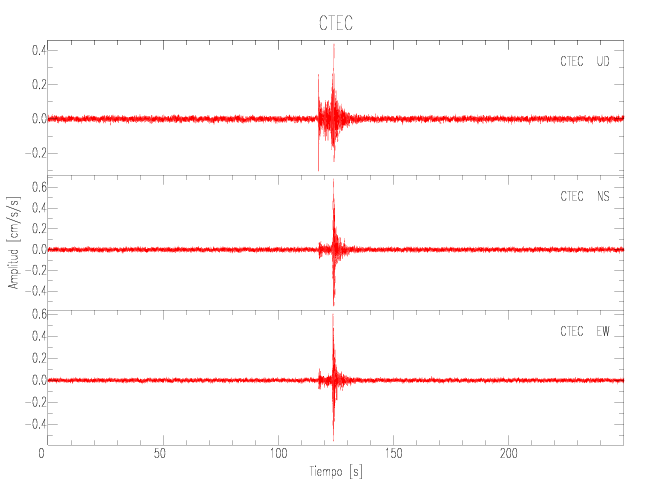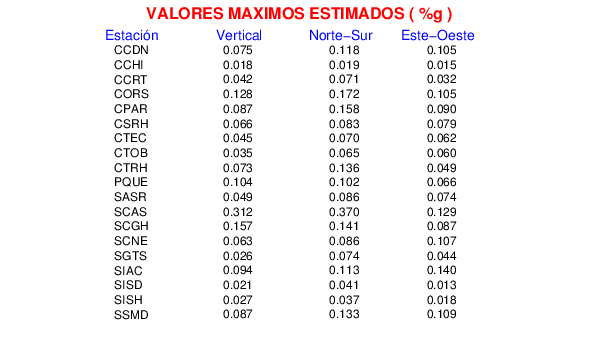 La siguiente tabla muestra los datos de aceleración máxima para cada componente en porcentaje de la aceleración de la gravedad (%g). Estos se obtienen dividiendo el valor del PGA registrado por 980 cm/s2 y multiplicándolo por 100.