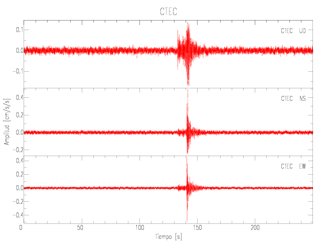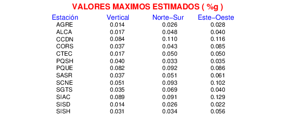 La siguiente tabla muestra los datos de aceleración máxima para cada componente en porcentaje de la aceleración de la gravedad (%g). Estos se obtienen dividiendo el valor del PGA registrado por 980 cm/s2 y multiplicándolo por 100.