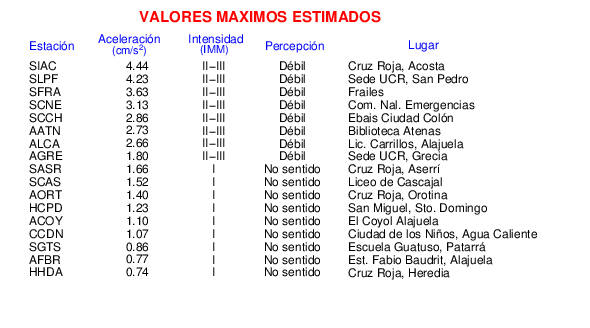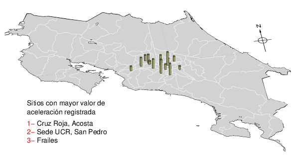 Intensidades en sitios de registro.Cada uno de los cuadrados en el mapa corresponde a la ubicación de un acelerógrafo al momento del sismo. Estos se muestran en distintos colores según la escala mostrada al pie de la figura.
