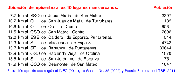Mapa de la zona epicentral. Se muestran las poblaciones más cercanas al epicentro y fallas activas. Abajo están las distancias que hay del epicentro a cada uno de los diez sitios más cercanos y la cantidad de habitantes que poseen.