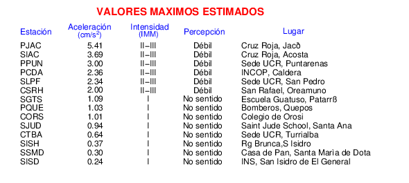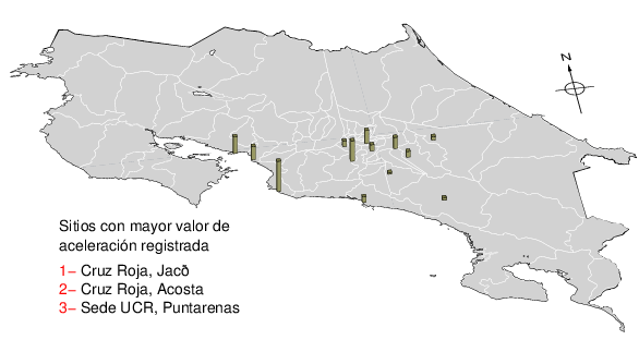 Intensidades en sitios de registro.Cada uno de los cuadrados en el mapa corresponde a la ubicación de un acelerógrafo al momento del sismo. Estos se muestran en distintos colores según la escala mostrada al pie de la figura.