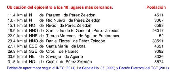 Mapa de la zona epicentral. Se muestran las poblaciones más cercanas al epicentro y fallas activas. Abajo están las distancias que hay del epicentro a cada uno de los diez sitios más cercanos y la cantidad de habitantes que poseen.