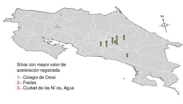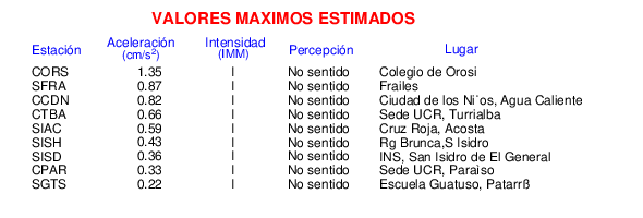 Intensidades en sitios de registro.Cada uno de los cuadrados en el mapa corresponde a la ubicación de un acelerógrafo al momento del sismo. Estos se muestran en distintos colores según la escala mostrada al pie de la figura.