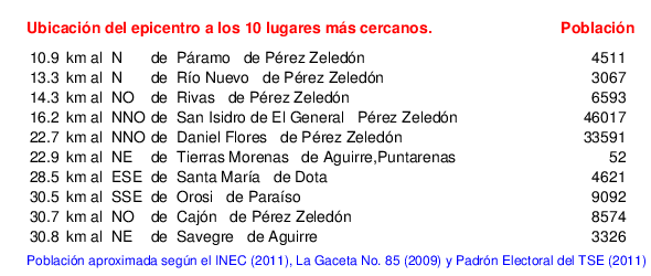 Mapa de la zona epicentral. Se muestran las poblaciones más cercanas al epicentro y fallas activas. Abajo están las distancias que hay del epicentro a cada uno de los diez sitios más cercanos y la cantidad de habitantes que poseen.