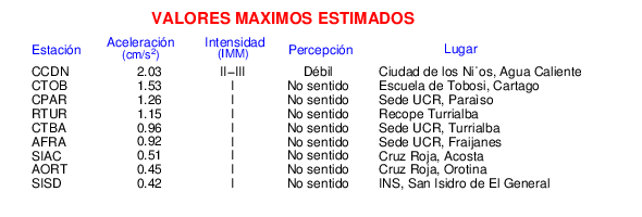 Intensidades en sitios de registro.Cada uno de los cuadrados en el mapa corresponde a la ubicación de un acelerógrafo al momento del sismo. Estos se muestran en distintos colores según la escala mostrada al pie de la figura.
