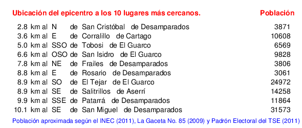 Mapa de la zona epicentral. Se muestran las poblaciones más cercanas al epicentro y fallas activas. Abajo están las distancias que hay del epicentro a cada uno de los diez sitios más cercanos y la cantidad de habitantes que poseen.